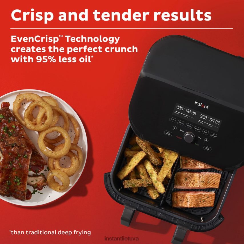 ši momentinė sūkurinė oro gruzdintuvė yra nuostabiai universali, su versazone technologija. gaminkite viename 9 qt krepšyje dideliems šeimos patiekalams arba pereikite prie dviejų 4,5 qt krepšelių, kad gautumėte dvi atskiras porcijas tuo pačiu metu. „Synccook“ ir „Syncfinish“ automatiškai suderina gaminimo nustatymus arba suderina dviejų krepšelių pabaigos laiką. „Evencrisp“ oro srauto technologija kiekvieną kartą užtikrina traškius, švelnius rezultatus su 95 % mažiau aliejaus, palyginti su kepimu giliame keptuvėje. 6 gaminimo programos suteikia jums prieigą prie paprastų receptų vienu mygtuko paspaudimu, tačiau leidžia pritaikyti juos patiems. o kadangi kepimo krepšelis, kepimo padėklas ir skirstytuvas yra nepridegantys ir tinkami plauti indaplovėje, išvalykite jį akimirksniu. atsisiųskite vartotojo vadovą